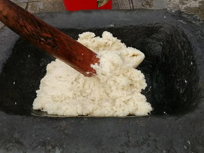1月27日,在云南的實踐隊成員與家人一起進行了舂粑粑這項活動。首先,選擇優質的糯米和飯米,通常按3:1的比例混合。隨后將米浸泡在水中至少4個小時以確保米充分吸收水分。第二天,將浸泡好的米蒸熟,經過兩次蒸煮以確保米粒完全熟透。將蒸熟的米飯放入傳統的石臼中。舂粑粑時,幾個人會輪流用腳踩踏碓尾,使碓頭有力地起落,舂搗石臼中的糯米。這個過程需要一定的節奏和力量,以確保糯米舂得細膩均勻。在舂米的過程中,需要一位經驗豐富的操作者在石臼旁迅速而精準地翻動米團,確保每一處糯米都能均勻受力。當米飯舂成粑粑狀后,操作者會將米團從碓柱上取下,放在涂好蜂蠟或香油的芭蕉葉上,攤成薄餅狀進行陰干。