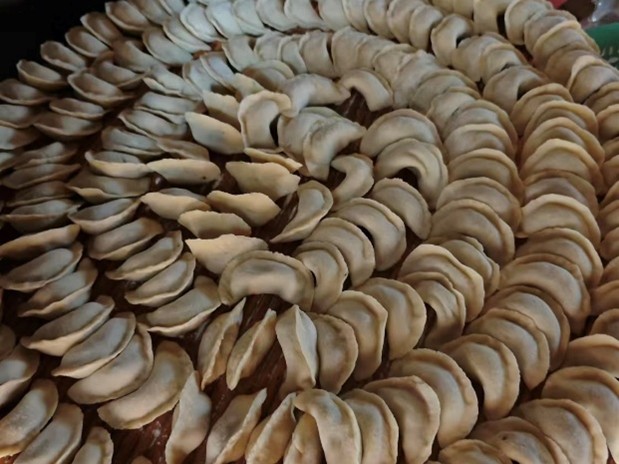 實踐隊成員也參與了寓意團團圓圓,幸福美滿的“炸三樣”和包餃子,在大家的共同努力下,一個個元寶形狀的餃子整整齊齊地擺放在案板上,寄托了人們對新年的期待和美好愿景。鍋里翻滾的肉丸滋滋作響,像是在為新的一年祈福。