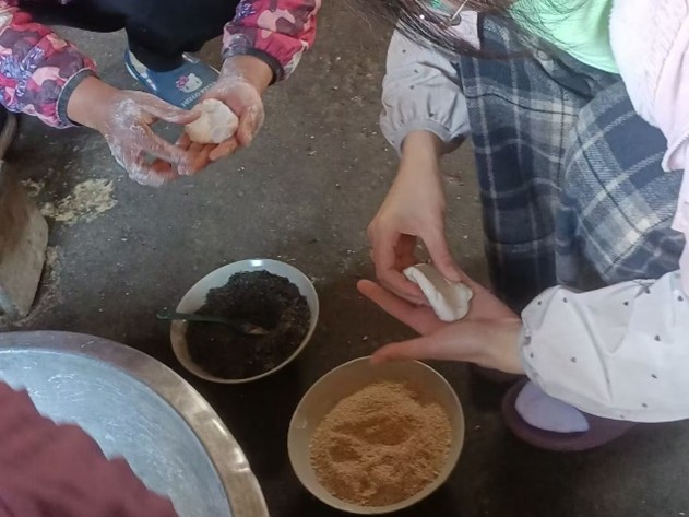 1月26日,在廣西柳州的實踐隊員參與制作春節傳統美食油堆和窯雞。制作油堆時,先把紅薯蒸熟并壓成泥狀,同時將花生、核桃碾碎,與芝麻、糖、黃油混合制成餡料。接著用開水燙部分糯米粉,再與紅薯泥、糖和水揉成面團,分成小塊包入餡料搓圓,最后在六成熱的油鍋中炸至金黃。制作窯雞時,先用黃土塊搭成錐子型土窯,生火至土塊變紅,把用錫紙包好的雞和紅薯放入,推倒土窯燜制。整個過程充滿節日氛圍。圓圓的油堆代表了團團圓圓,在新的一年一家人團團圓圓的過大年才是最幸福的事。窯雞不僅是一道美味的傳統食品,更是春節期間家庭團聚、傳承文化的重要載體。它讓人們在享受美食的同時,也感受到了濃厚的年味和家的溫暖。