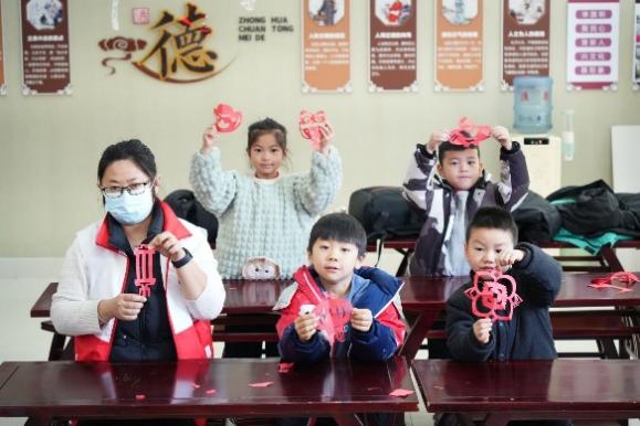 圖為社會實踐隊成員為小朋友示范剪紙的過程。通訊員 龔炫偉 供圖