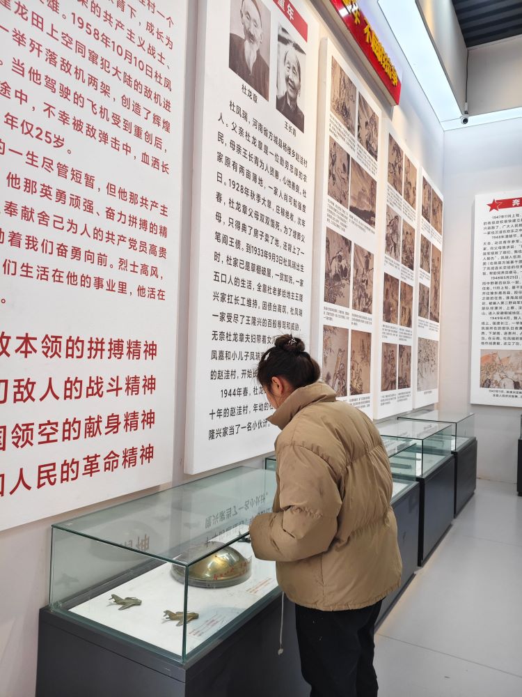 圖為團隊成員聚精會神地觀看杜鳳瑞烈士的生平革命事跡展覽,杜鳳瑞烈士的光榮革命歷程令團隊成員們深受觸動。 白雪供圖