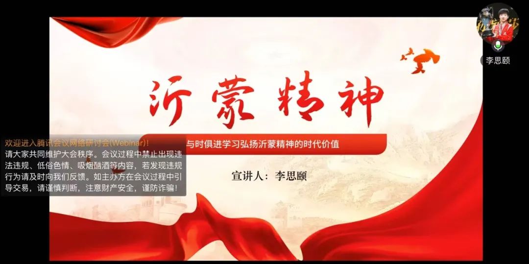 接著,青島科技大學(xué)高露同學(xué)向大家介紹了沂蒙精神的具體內(nèi)涵。“黨群同心、軍民情深、水乳交融、生死與共”是對沂蒙精神的高度凝練。體現(xiàn)了黨、軍隊、人民之間的緊密聯(lián)系和深厚情感,幫助同學(xué)們樹立正確的價值觀,信念不動搖的聽黨話、跟黨走。