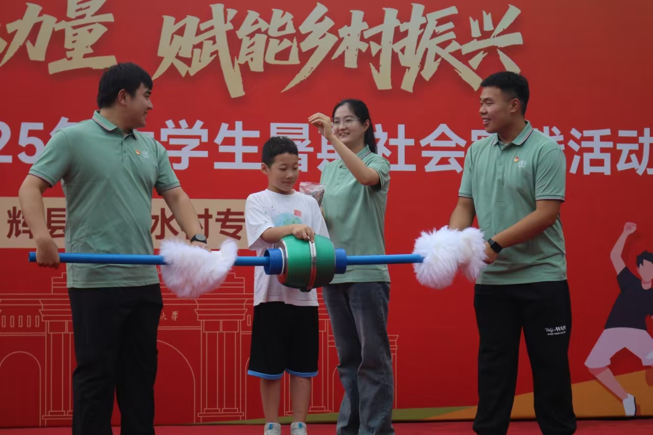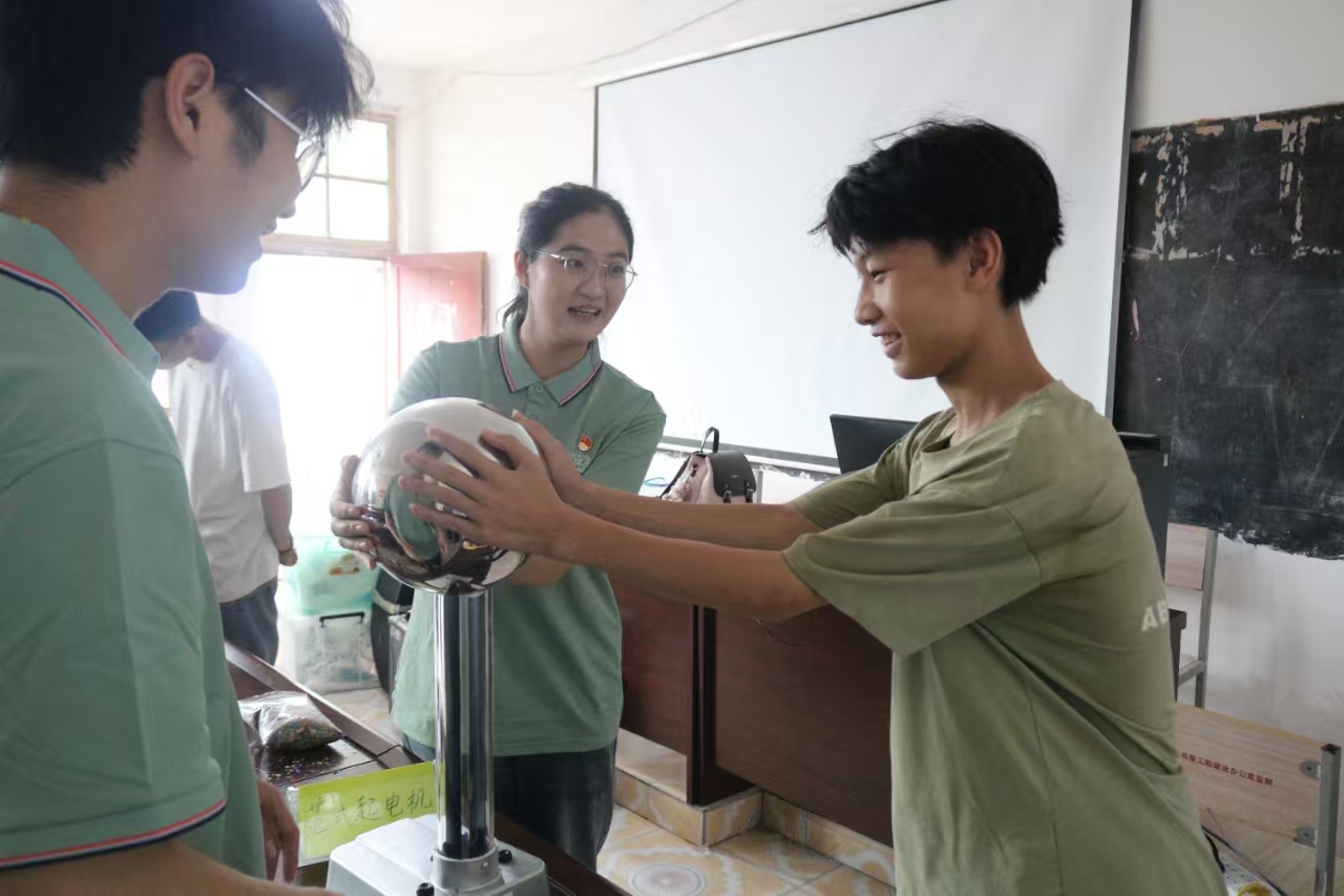 7月1日上午,物理學院“移動科技館”科普志愿服務隊深入新鄉市輝縣黃水鄉黃水村開展科學巡演活動。活動以科創素質拓展表演拉開了序幕,“看見的聲音”將聲波化作跳動的光柱,“吐火的泡泡”在陽光下炸開絢麗的火球,引得孩子們陣陣驚呼,現場氛圍熱烈。隨后,孩子們排著隊觸摸會“放電”的范式起電機,親手摩擦能噴水的魚洗盆,指尖真實的震顫與掌心飛濺的水花將活動氛圍引向高潮。現場參與活動的青少年們紛紛表示平時很少有機會接觸科技展示,現在能夠親身參與并直觀、生動地了解相關科學知識,收獲滿滿。隨后,實踐隊員為同學們們送上精心挑選的科學家傳記。