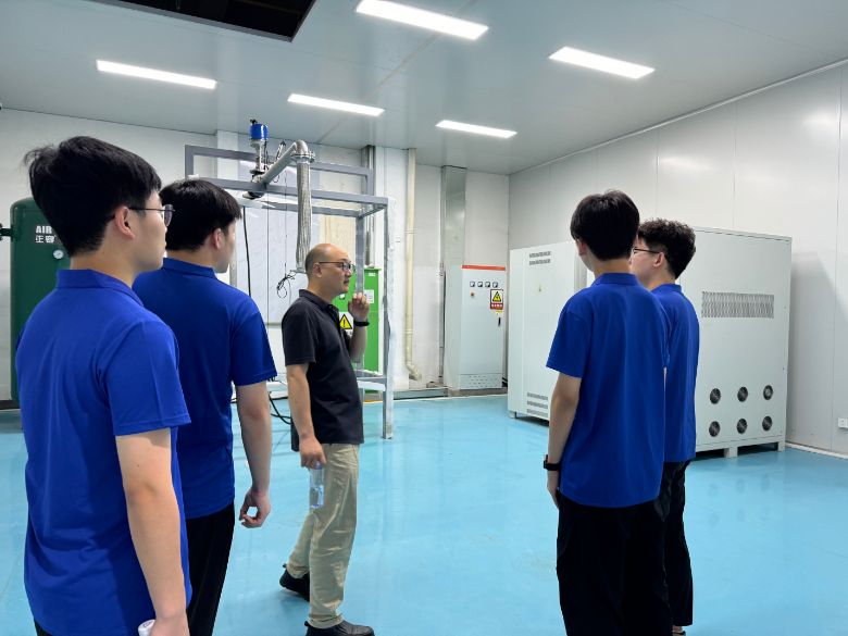 風機車間:協同制造之舞 走進風機裝配車間,隊員們在2025年全國勞動模范、金士頓科技總工程師、河科大校友何波的帶領下,見證了零部件如何精密協作成為完整風機以及風機的測試與檢驗。何波現場講解了軸承作為核心部件的關鍵作用,尤其是空氣軸承極為重要,他嫻熟的技藝和對細節的追求,生動展示了機械裝配的藝術與協同制造的精妙。隊員們也向這位榮獲國家最高勞動者榮譽的校友表達崇高敬意。