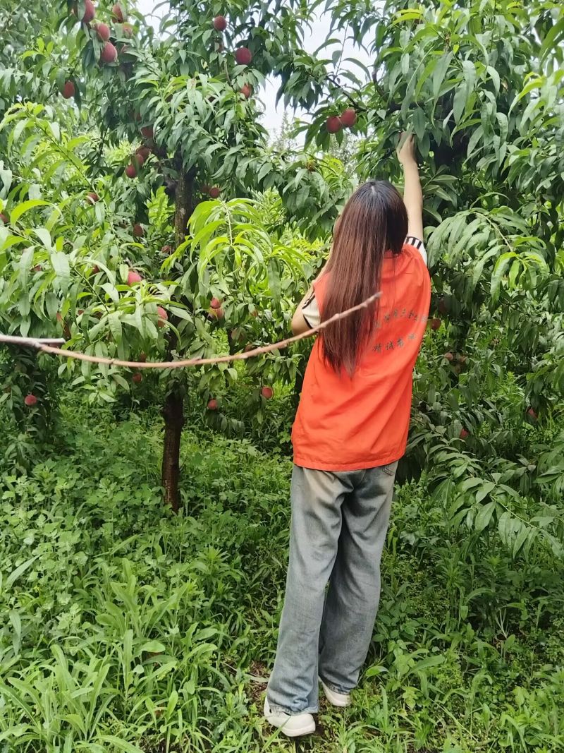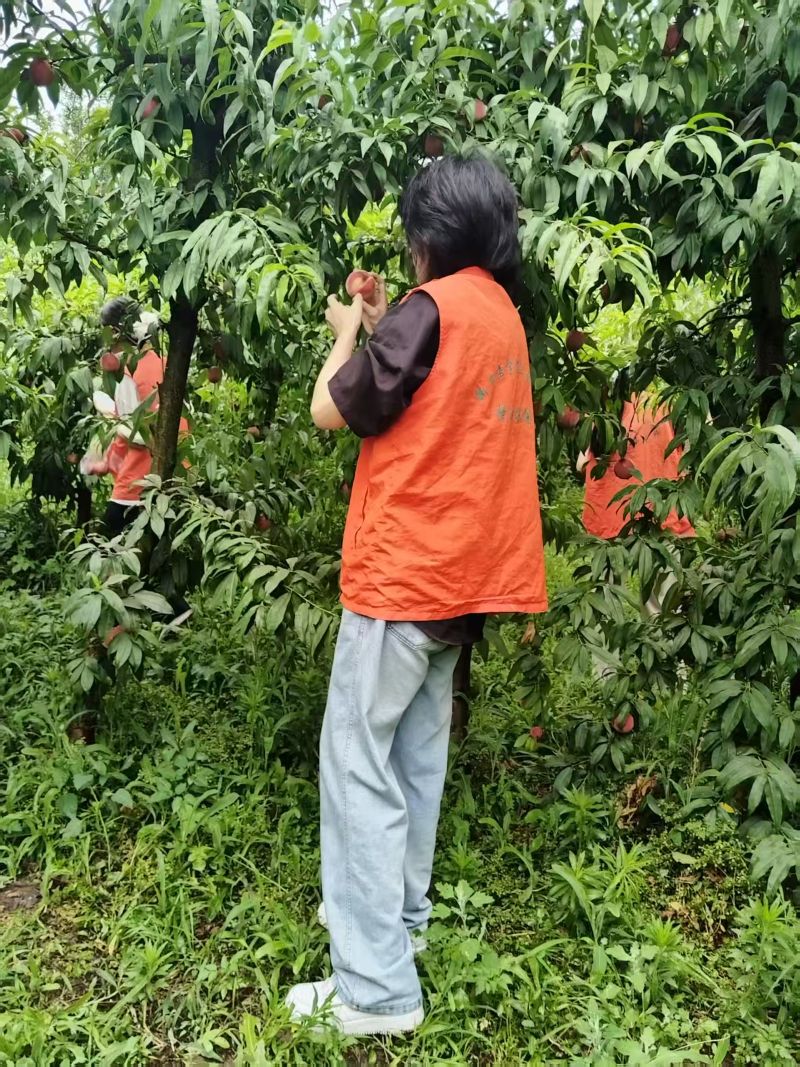 15名志愿者身穿紅馬甲合理分工開展桃園采摘作業:女生使用專用采摘工具沿果枝基部輕旋摘果,確保果蒂完整;男生則接力搬運。團隊嚴格落實文明采摘原則,為售賣儲備標準化貨源。