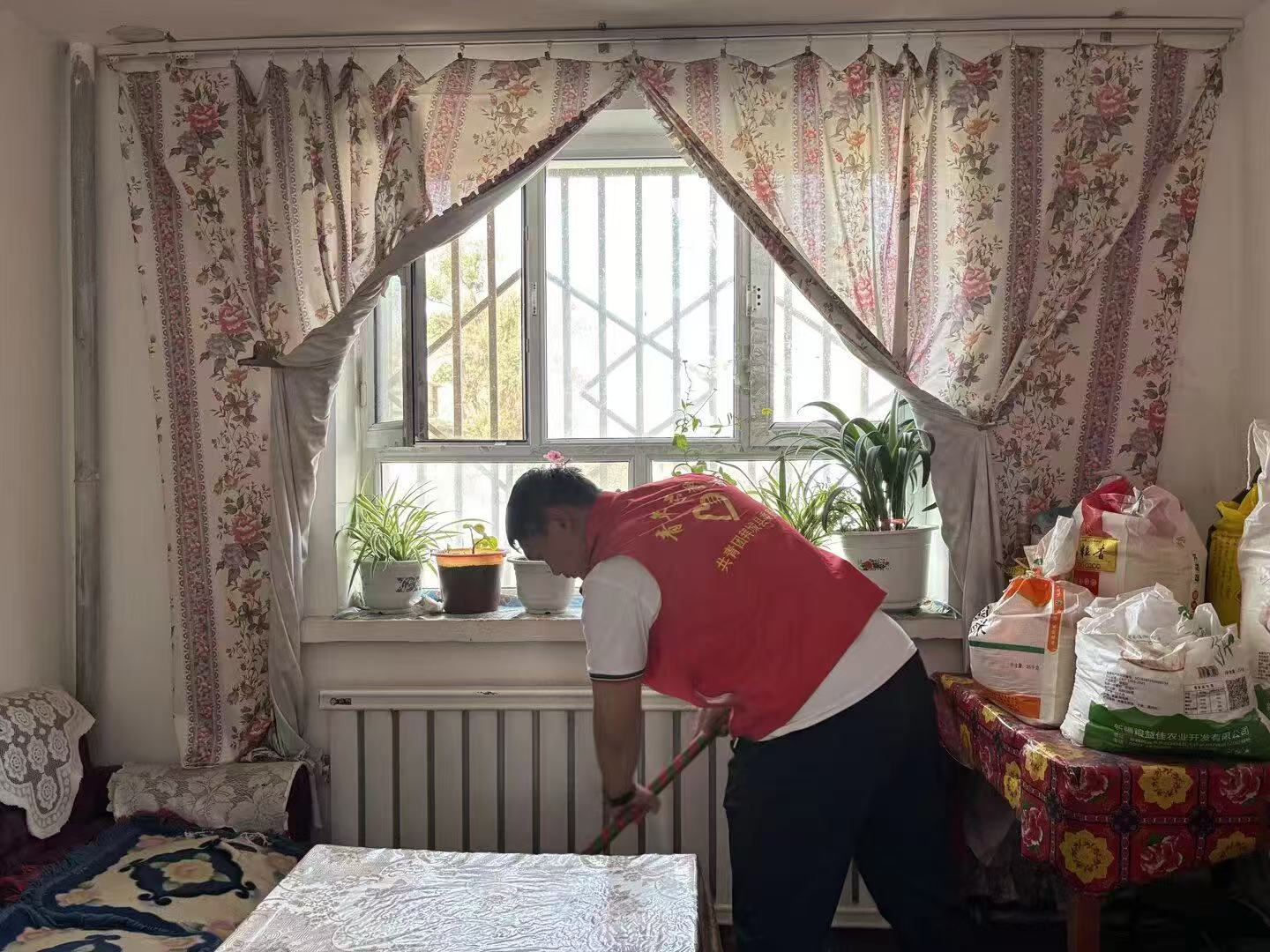 實(shí)踐隊(duì)員打掃孤寡老人住所(攝/于思佳 阿婭拉·烏拉力別克 )