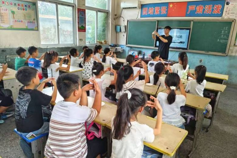 圖四:書法老師教孩子們握筆 胡景碩攝