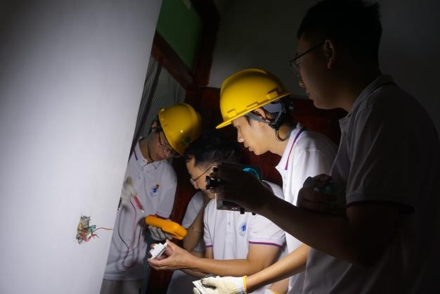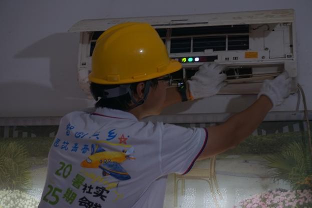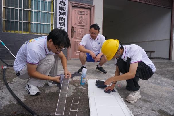 下午,團隊深入村民家中。在文銳教授的指導下,維修團隊發揮專業優勢,細致排查老舊線路隱患,為村民更換損壞的開關、燈泡,確保用電安全。同時認真清洗村民家中的空調濾網,并講解日常維護常識。