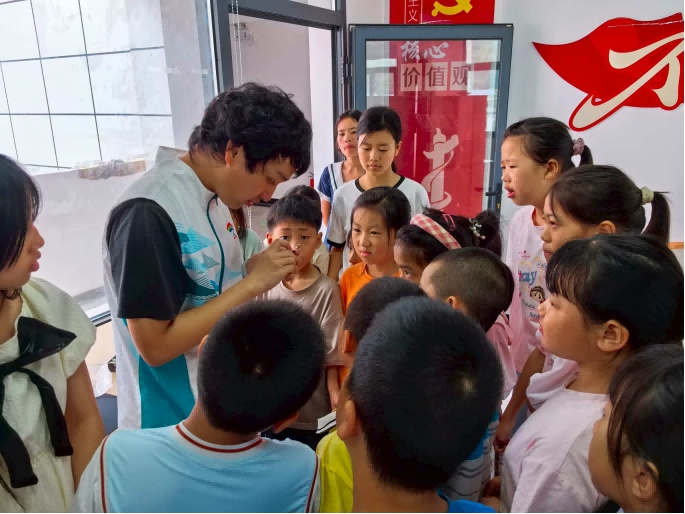 實(shí)踐隊(duì)設(shè)計(jì)了語文、數(shù)學(xué)和英語等基礎(chǔ)知識特色課程。李樂平通過“句型投籃”游戲強(qiáng)化了同學(xué)們對英語句型的理解;劉夢莎以“數(shù)形結(jié)合”方法教會同學(xué)們破解數(shù)學(xué)難題;申航行通過《一個蘋果》革命故事激發(fā)了同學(xué)們的愛國熱情。針對高年級學(xué)生,實(shí)踐隊(duì)提供了一對一課業(yè)輔導(dǎo),受到了當(dāng)?shù)貙W(xué)生及居民的一致好評。