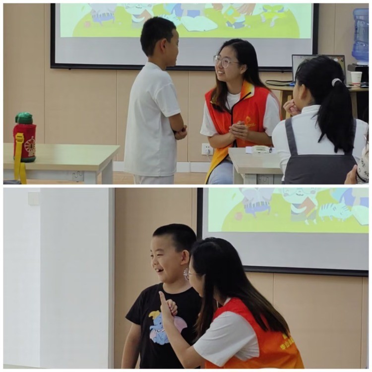 ▲圖為課間休息時支教隊隊員引導小朋友們自信地表演節目