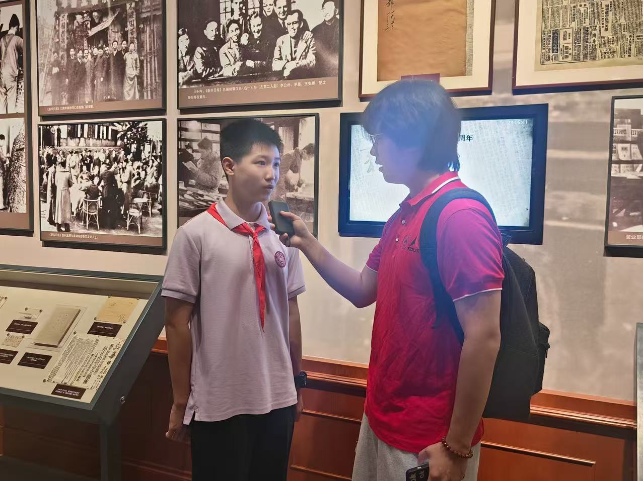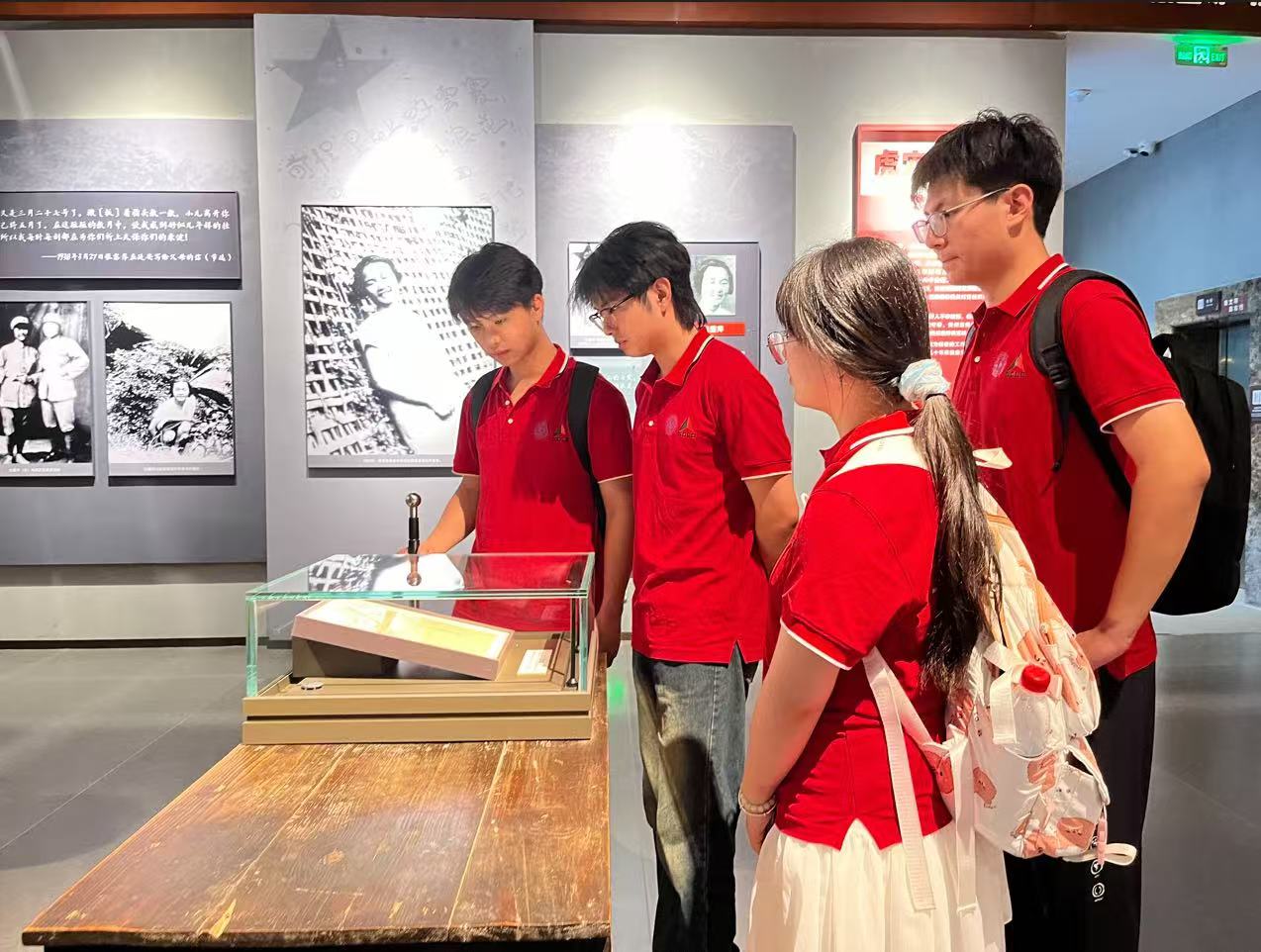 實踐團隊于7月16日前往紅巖革命紀念館和中國民主黨派歷史陳列館,進一步了解重慶在中國抗戰時期的重要作用。在紅巖革命紀念館內,實踐隊伍與同樣前來參觀學習的南開(融僑)中學的學生們相遇,展開了一場圍繞紅色歷史與精神傳承的友好交流。在交流過程中,王一凡同學談及自己印象最深刻的展品時,難掩激動之情,他指著那臺統一戰線時期使用的印刷機向實踐隊員介紹:“正是靠著它印刷出的一篇篇文章、一份份報刊,讓紅巖精神在每一個愛國人士的心中生根滋養,讓星星點點的抗戰星火匯聚成燎原之勢,不斷點燃全國人民的抗戰反擊士氣。”同時,王同學也提出了自己對于紅色文化傳承的見解,他表示在新時代背景下,“互聯網+”的傳播方式相較于傳統方式,更能被青少年所接受,也能讓青少年更主動地成為紅色文化的發言人。實踐隊員還了解到,包括南開(融僑)中學在內,重慶當地一直在不斷探索紅色文化新的發揚方式,努力讓重慶的紅色基因注入每一個在這片土地上的人心中,讓紅色精神在新時代煥發新的生機與活力。