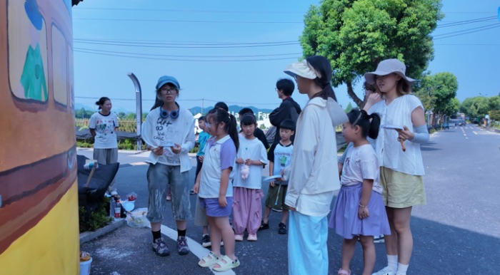 藝術設計組經過連續奮戰,“田園火車”主題墻繪宣告圓滿完工!生動的畫面立刻吸引了村民和過往游客駐足觀看、拍照。她們全力攻堅第二面“牧童放牛”墻繪,色彩鋪陳漸趨飽滿,田園詩意躍然墻上。藝術設計組也精心準備并主持了“廈大實踐隊&杭州徑山鎮”公益課堂。在7月15日、16日的課程中分別講解了“詩朗誦”和“茶水畫”,吸引了數十位當地兒童的參與。孩子們畫出獨一無二而繽紛多樣的茶畫,村民們執筆體驗水墨的禪意,現場氣氛熱烈。傳播組全程記錄下這藝術浸潤鄉村的溫馨場景。