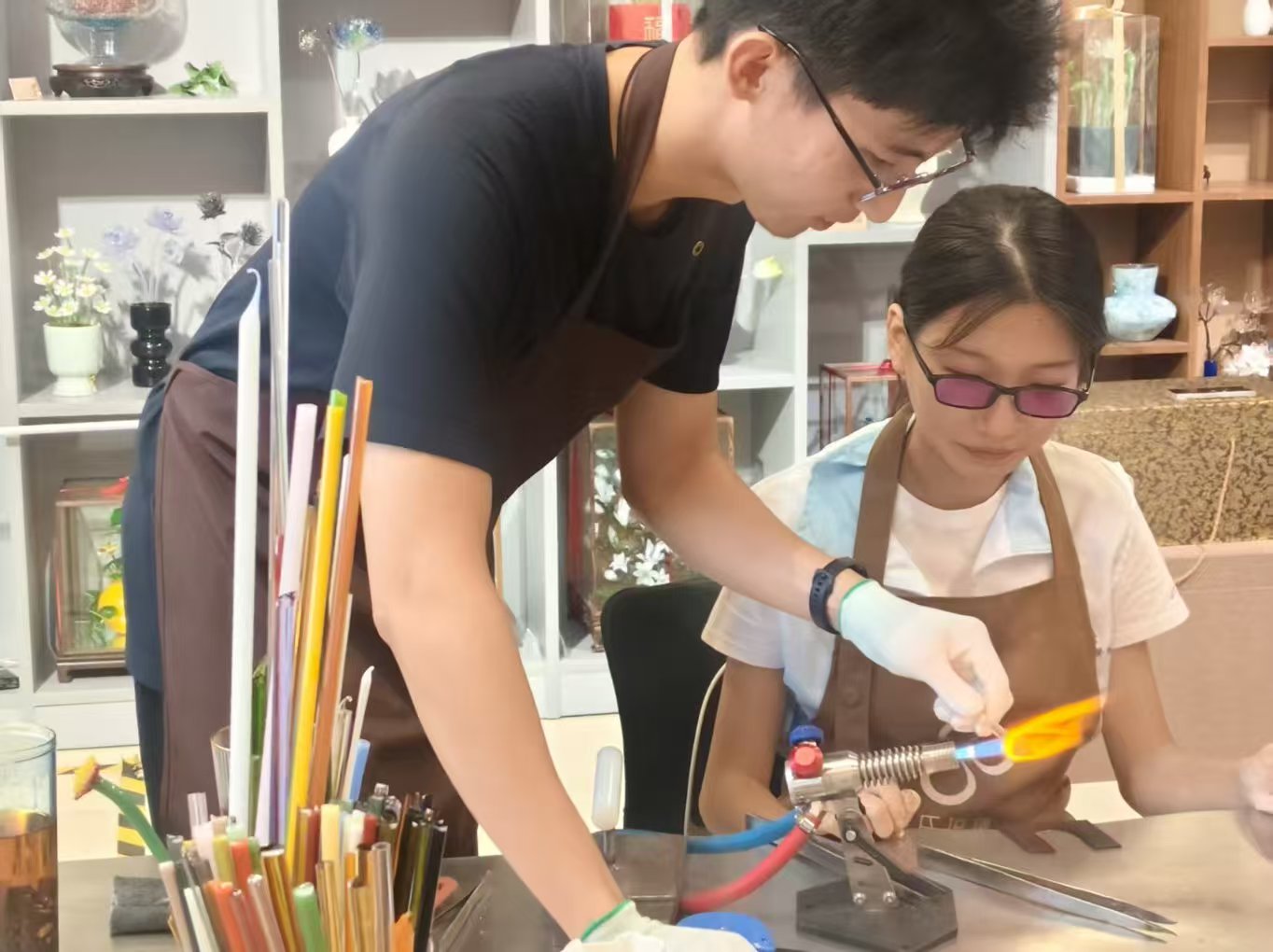 實踐首站,淄博陶瓷琉璃博物館為我們揭開了琉璃世界的神秘面紗。上午,在琳瑯滿目的展廳里,從古樸的先秦琉璃珠到精妙絕倫的現(xiàn)代琉璃藝術(shù)品,一部跨越千年的琉璃發(fā)展史在我們眼前徐徐展開。每一件展品都濃縮著不同時代的審美與技藝,無聲訴說著匠人們的執(zhí)著與智慧。尤為珍貴的是親手體驗環(huán)節(jié):在專業(yè)師傅指導(dǎo)下,我們嘗試制作琉璃小掛件。軟化后的琉璃料在手中顯得既脆弱又充滿無限可能。通過簡單的拉絲、塑形,我們真切體會到“火中取藝”的艱辛與快樂,深刻認(rèn)識到每一件流光溢彩的琉璃背后,都凝聚著無數(shù)次精準(zhǔn)的火候把控與千錘百煉的手上功夫。下午,實踐隊員轉(zhuǎn)換為志愿者身份,協(xié)助館方進行秩序引導(dǎo)與展品介紹工作。服務(wù)過程中,我們不僅鞏固了上午所學(xué),更在與觀眾的交流中感受到公眾對琉璃文化的濃厚興趣,也體會到文化傳播者的責(zé)任與擔(dān)當(dāng)。