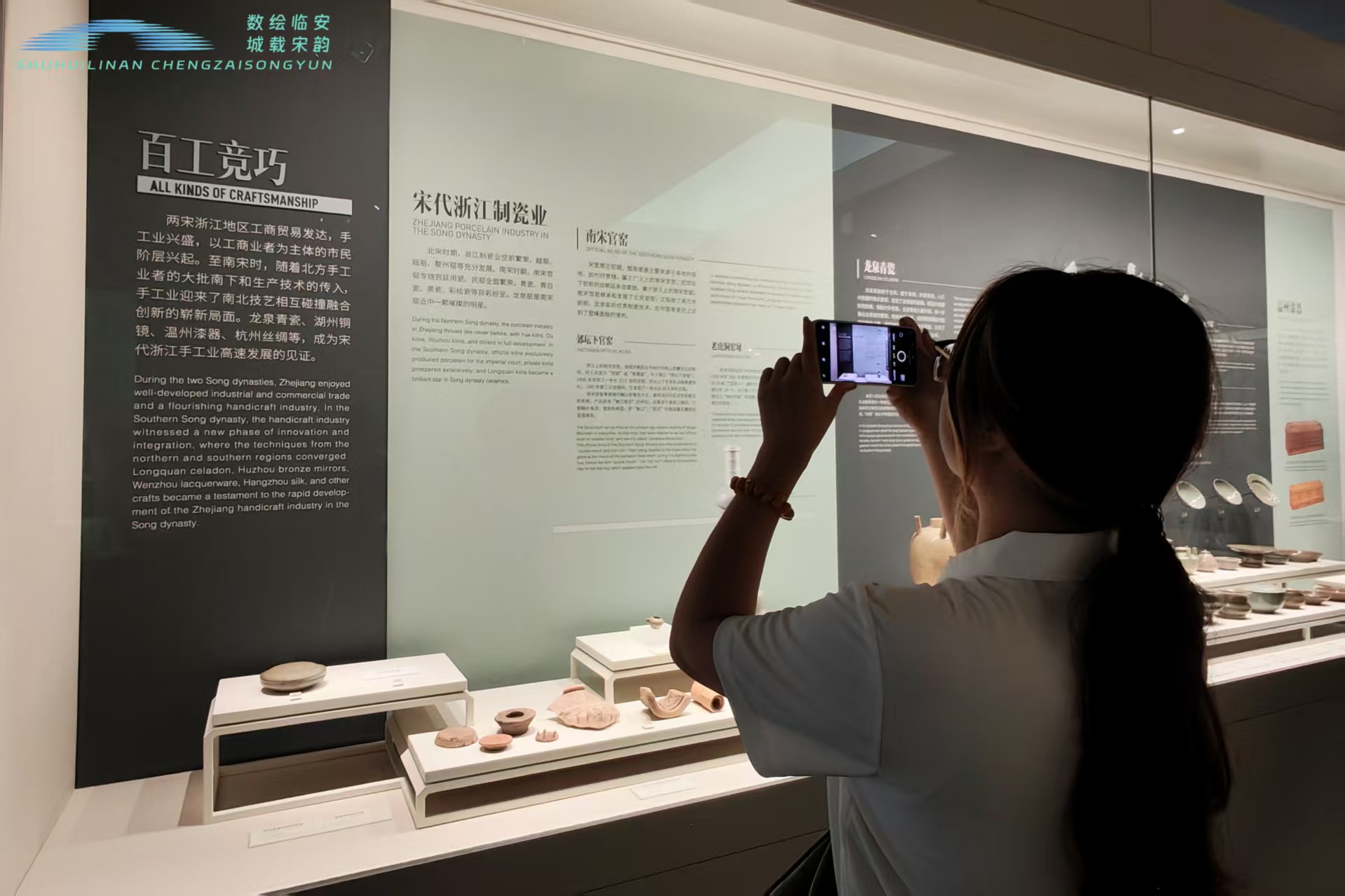 在杭州方志館的史料印證后,德壽宮遺址帶給隊員們前所未有的震撼。站在重華殿遺址區,戴上VR設備,工字殿瞬間在眼前拔地而起,飛檐斗拱,簡約而氣韻生動。“以前看古建復原圖沒感覺,但VR讓我‘走’進去了!宋代那種‘少即是多’的建筑美學,變得無比直觀和震撼。”建筑學背景的小黃興奮不已。慈福宮遺址則上演著現實與虛幻的協奏曲,全息投影讓殘存的基石上“生長”出完整的宮殿輪廓。“科技讓遺址不再冰冷,它賦予了歷史場景以鮮活的生命力,仿佛能聽到當年宮苑里的細語。”隊員們在文創區流連忘返,那些融合傳統元素與現代設計的文創產品,也點燃了他們后期設計宋韻文創的靈感火花。“原來,古老的文化可以如此時尚地表達。”