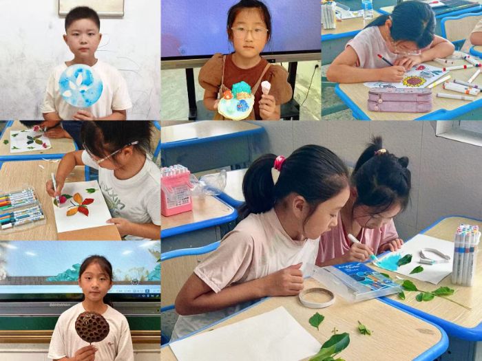 學生們還收集豆莢、蓮蓬、落葉等自然素材,制作種子書簽、蓮蓬燈、樹葉拼貼畫、植物噴繪扇等手工藝品。當皺縮的豆莢蛻變為雅致書簽,枯萎的蓮蓬化作暖光燈具,“美”不再是抽象概念,而是具象化為一件件鮮活作品,讓學生真切體悟勞動與美的和諧共生。