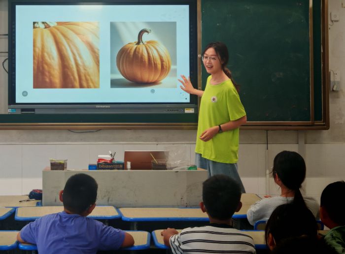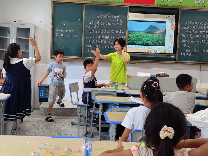 志愿者們設計“農耕詩誦”“節氣演繹”“農諺接龍”“耕史講堂”“田園詩會”“時令農課”等互動活動,以趣促學,幫助學生在多元體驗中觸摸農耕文化。情景演繹環節,孩子們生動的神情、靈動的表演讓經典文本鮮活起來;耕史講堂里,志愿者延伸講解休耕防蟲、菜園輪作等農耕智慧,將文字里的勞作場景與真實的農事經驗緊密相連,深化學生對勞動精神的感悟。