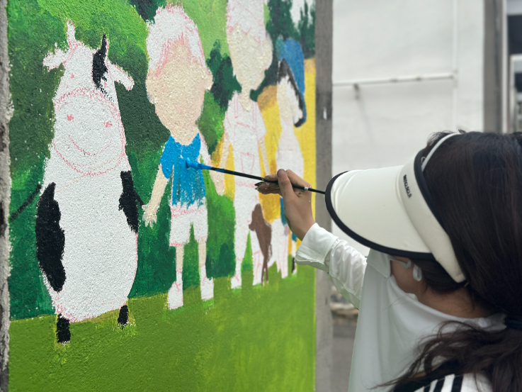7月22日至25日,靈光村實(shí)踐分隊(duì)緊扣當(dāng)?shù)?ldquo;蘿卜之鄉(xiāng)”“菌菇基地”的產(chǎn)業(yè)特色,巧妙融入千年虞姬傳說(shuō),展開藝術(shù)創(chuàng)作。團(tuán)隊(duì)成員不畏40℃酷暑,在42平方米的墻面上精心繪制:水靈如玉的白蘿卜掛著露珠,肥厚的菌菇堆積成山,畫面中心生動(dòng)呈現(xiàn)村民聊天、采收的溫馨勞作場(chǎng)景,一派豐收繁榮景象。設(shè)計(jì)亮點(diǎn)在于,團(tuán)隊(duì)成員以虞姬飄逸的緋色水袖為創(chuàng)意紐帶,串聯(lián)起象征現(xiàn)代發(fā)展的燈泡圖案,讓歷史傳說(shuō)與現(xiàn)代農(nóng)業(yè)在墻面上巧妙交融。駐村馬書記欣喜地指著壁畫向孩子們講解:“看!仙女的袖子變出咱們的飯碗啦!”活動(dòng)期間,團(tuán)隊(duì)還受邀與礦大支教團(tuán)合作,為村中兒童帶來(lái)生動(dòng)的手工美術(shù)課,共同制作橡皮泥娃娃,并引導(dǎo)孩子們參與戶外墻面點(diǎn)綴,天馬行空的童趣為畫作增添了別樣色彩。