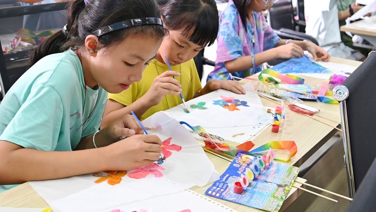 團隊開設風箏制作、漆扇繪制、植物拓染、扎染等手工課程,結合當地兒童對勞動的認知,采用“步驟拆解+示范操作”的教學方式,引導學生獨立完成作品。孩子們在課程反饋中寫道:“我學會了用樹葉的顏色印在布上,回家想教媽媽一起做”,質樸語言體現了實踐育人的效果;兒童在作品旁標注“世界那么大,我想去看看”,展現出團隊課程對鄉村兒童視野的拓寬作用。