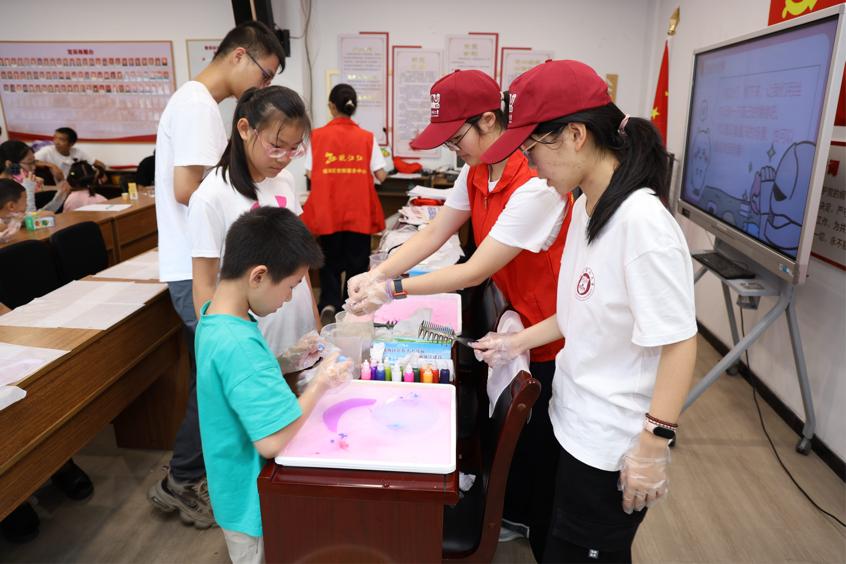 圖為溫州醫科大學巾幗筑夢暑期社會實踐團成員協助小朋友完成水拓絲巾 孫旭陽攝