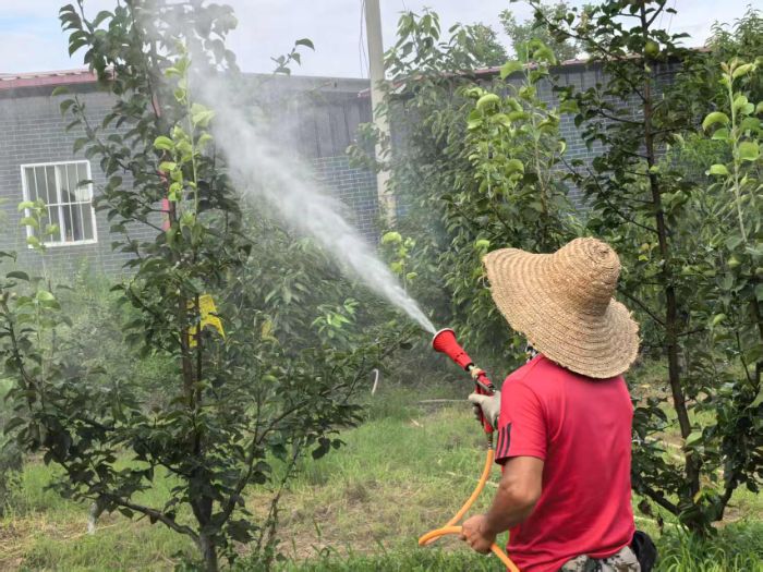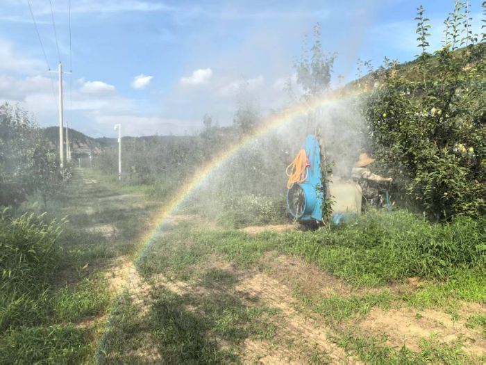 姚大叔最近每天都要六點多就起來,因為天氣炎熱,打藥只能在早上九點之前和下午四點之后打,不然打藥的效果不好,每一次打藥的過程中,他都開著打農藥的車行駛在果林當中,農藥從水槍里噴灑出來落在葉片上,在車無法進入的地方,他就背著裝滿農藥的水桶拿著打藥的水槍進行人工打藥,盡管姚大叔已經選擇了清晨和下午進行打藥,但氣溫還是達到了35度左右,汗水浸濕了姚大叔的衣服,而姚大叔的臉上也流滿了汗水,然而,盡管如此,據姚大叔所說,夏天還算比較輕松的,工作量不算特別大。
