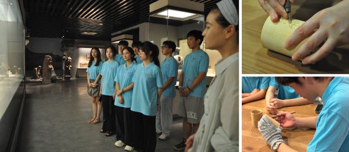圖為實(shí)踐團(tuán)成員聆聽館員講解、體驗(yàn)制作場(chǎng)景