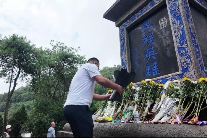 8月7日,實踐團冒雨奔赴騰沖國殤墓園與來鳳山戰場遺址。國殤墓園依山而建,9168座“忠”字形墓碑,銘刻著1944年收復騰沖的遠征軍英名。“127晝夜血戰,寸土皆染數十英魂。”講解員話音落,現場肅然,成員肅立敬獻花籃。