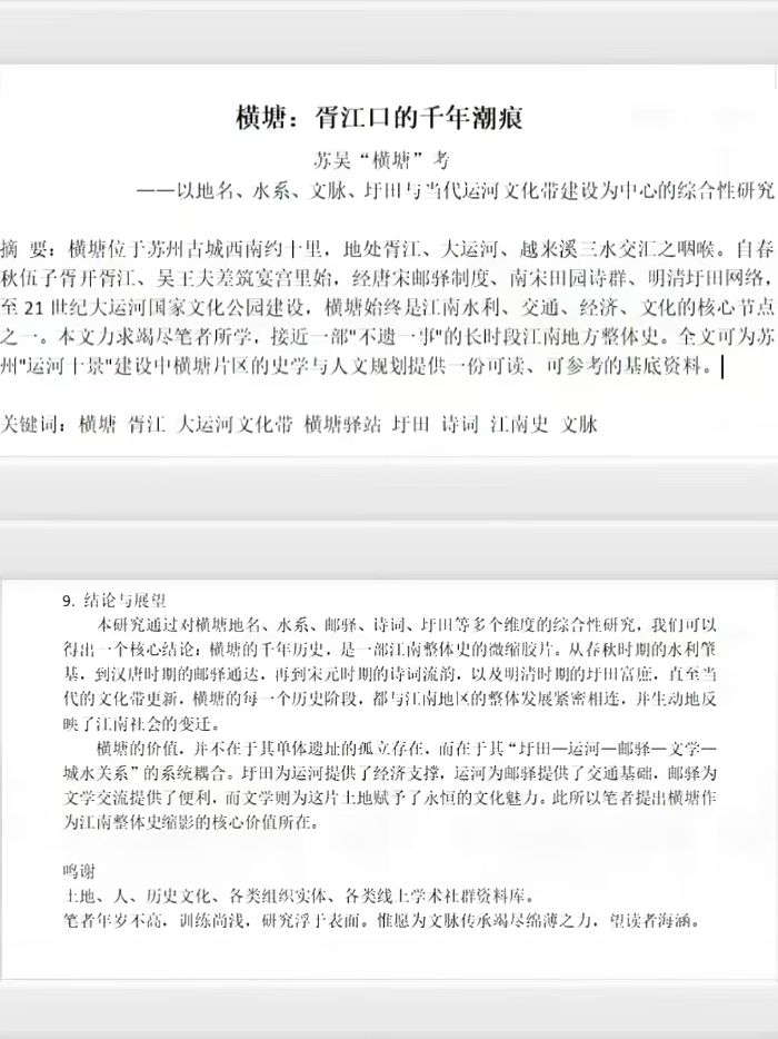行走在橫塘古地,團隊成員醉心于江南文化。八月初,團隊長白涵予為此次暑期社會實踐撰寫了一篇論文,名為《橫塘:胥江口的千年潮痕》,聚焦蘇州橫塘,從地名溯源著手、延展水系、圩田、文脈、實物等復合維度維度進行史學研究。橫塘地處三水交匯咽喉,歷史超2500年,是江南水利、交通、經濟、文化核心節點。論文梳理其從春秋至當代的發展,分析水利、圩田等對江南的影響,及在大運河文化帶建設中的規劃,揭示其作為江南整體史縮影研究案例的價值。