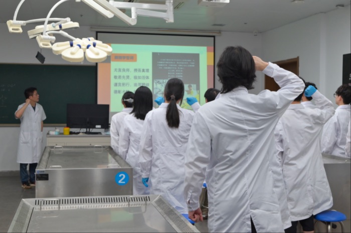 大一的同學是第一次這樣近距離操刀人體局部標本,對于他們而言,這是一次學習專業解剖知識的重大挑戰,也是一次絕佳的提前學習局部解剖學的機會。大二的同學已經學習了完整的解剖學課程,能夠比較熟練地具體指導大一的同學如何根據標本的實際情況來分離脂肪、剔除筋膜,對于他們而言,這是一次指導他人具體實踐的重大挑戰,也是一次難得的實際運用解剖學知識的機會。面對眼前的局部標本,小組成員齊心協力,快速翻閱書本,用心劃動解剖刀,日漸熟練,重要的血管神經在他們的分離下逐漸顯露,主要肌肉的表層筋膜也在解剖刀的揮動下漸漸褪去,小組成員高質量地完成了每日標本制作任務,認真對待每天的實踐日志。為了更好地滿足制作大型人體標本的需要,團隊成員靈活變通,采取2—3組共同完成一項標本制作的策略,互相學習、互相幫助,使標 本制作效率得到極大提高,同時,團隊成員每日進行經驗交流與成果分享,實現了團隊協作能力與實操技能的雙提升,為高質量完成標本制作任務提供了絕佳方案。