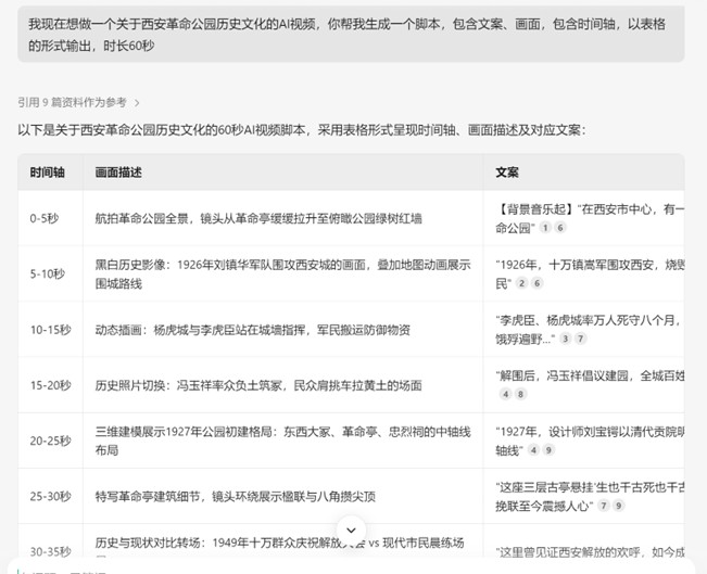 首先,通過DeepSeek生成精準分鏡腳本,輸入提示詞:“生成西安革命公園介紹視頻腳本,包含革命歷史講解、建筑特寫、參觀者互動等5個分鏡,要求歷史莊重感”。