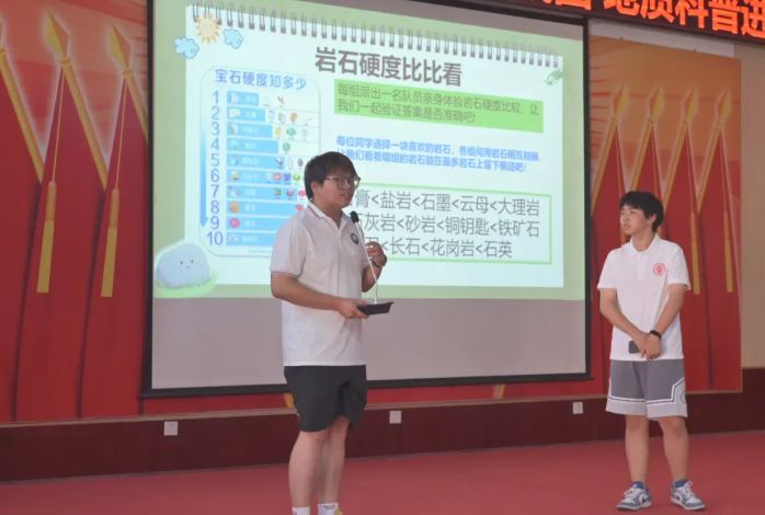 圖為實踐團成員參觀農講堂電子大屏+許菁攝 “石頭會唱歌”地質課上,實踐團充分發揮地學專業優勢,把抽象科學轉化為可觸可感的體驗:先通過動畫講述“巖石的一生”,勾起孩子們的好奇心;再開展“巖石硬度挑戰賽”,指導孩子們分組用鹽巖、石墨、花崗巖等相互刻畫,在觀察劃痕中同步講解并引導驗證“鹽巖<云母<石英”的硬度規律。看著孩子們手持放大鏡,模仿小地質學家研究巖石紋理,認真聆聽團隊成員解讀“石頭里的地質奧秘”,實踐團深刻感受到,大家作為一個團隊用專業知識將普通石塊轉化為鑰匙,成功為鄉村兒童點燃了探索自然的科學夢想。托地球物理專業特色,實踐團以“地脈勘探”為抓手,將專業知識與鄉村需求結合,在觀光棧道調研與地質實操中,為古將村發展注入專業力量。