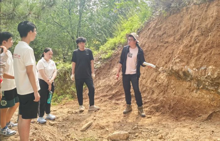 圖為實踐團成員進行地質科普小課堂+周思衡攝 沿著古將村在建的觀光棧道,實踐團成員相互攙扶向上攀登——面對崎嶇路況,團隊始終以探索鄉村發展的熱忱前行。這條步道雖未完工,卻讓成員們清晰感知到其承載的鄉村旅游增收期望。登頂時,群山環繞、村莊錯落的美景盡收眼底;下山途中,實踐團主動與修路工人深入交流,從“再難也要把路修好”的質樸話語里,深刻讀懂鄉村振興的艱辛與堅守。