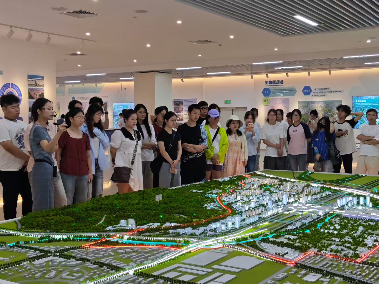 青年隊(duì)伍首站抵達(dá)江北新區(qū)規(guī)劃展覽館,通過(guò)全息投影與沙盤(pán)模型,成員們直觀了解新區(qū)“三區(qū)一平臺(tái)”戰(zhàn)略定位及“走進(jìn)未來(lái)”的城市愿景。同時(shí),芯片制造的納米級(jí)工藝展示讓萬(wàn)木青年們深刻體會(huì)到創(chuàng)新驅(qū)動(dòng)發(fā)展的分量。新區(qū)作為南京乃至全國(guó)的重要發(fā)展區(qū)域,其前瞻性的規(guī)劃和宏偉的發(fā)展目標(biāo)也讓青年們深感震撼。在講解員的引導(dǎo)下,青年們駐足于“兩城一中心”(芯片之城、基因之城、新金融中心)展區(qū),直觀感受新區(qū)千億級(jí)產(chǎn)業(yè)集群的布局邏輯;在“美好新生活”展區(qū),智慧醫(yī)療、智慧教育等民生場(chǎng)景的模擬演示,讓青年對(duì)“15分鐘生活圈”的規(guī)劃愿景充滿(mǎn)期待。