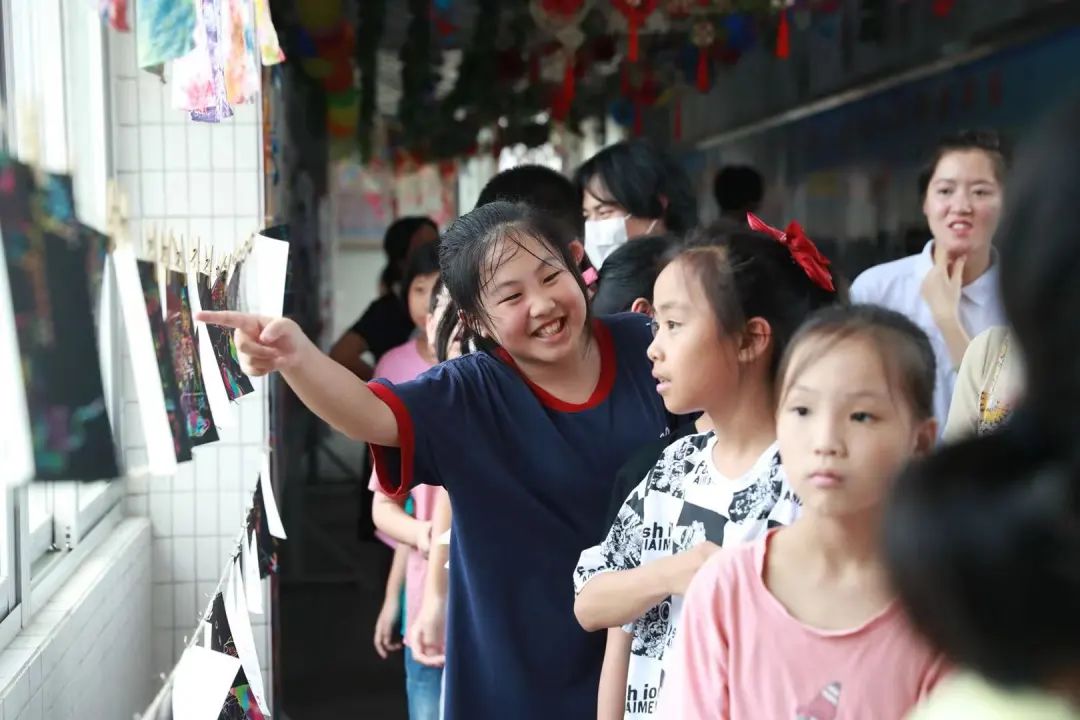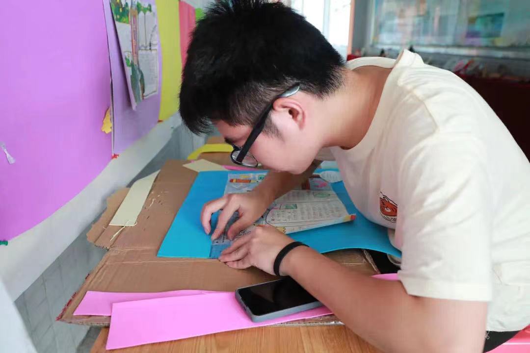 在支教的同時,益教微光社會實(shí)踐隊(duì)隊(duì)員與老師將同學(xué)們在藝術(shù)課堂、暑期完成的優(yōu)秀作品進(jìn)行收集并加工,通過舉辦成果展的形式來展示學(xué)生所創(chuàng)作的優(yōu)秀作品,其中成果展分為幾個部分,分別是“請黨放心,強(qiáng)國有我”主題的紙貼畫展、傳統(tǒng)文化剪紙繪畫展、社會主義價值觀掛牌展、手工扎染和刮畫展、繪畫、手抄報及手工作品展。