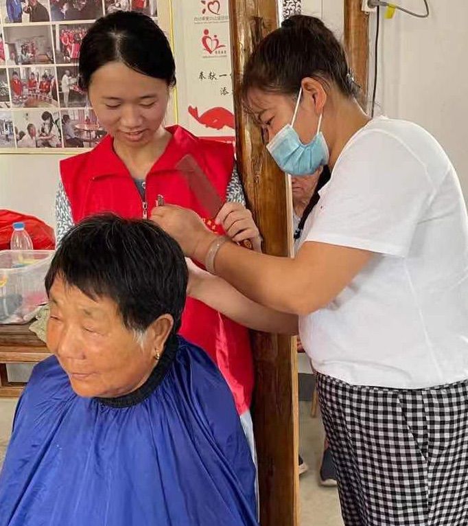 圖為實踐隊員在爸媽食堂給老人剪發。