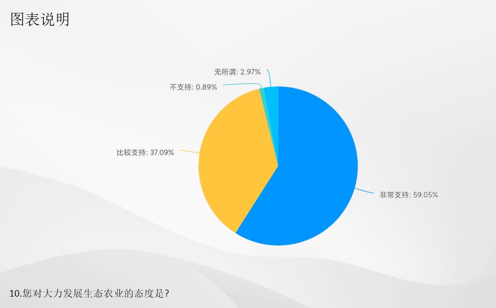 通過對線上問卷調研結果分析討論,團隊成員得出在國家對生態環境保護的重視程度不斷提高、我國經濟不斷發展的背景下,人民生活質量不斷提高,生態環境保護意識、綠色發展等理念深入人心,人們對生態農業的認知也在不斷提升,我國生態農業建設取得一定成效。生態農業具備循環高效利用自然資源、實現農業可持續發展、提高農民經濟收入等多項優勢,是我國科技進步、農業發展與綠色發展不斷融合的產物,是我國實現鄉村振興發展中不可或缺的一環,是堅持生態惠民、生態利民、生態為民的重要抓手。