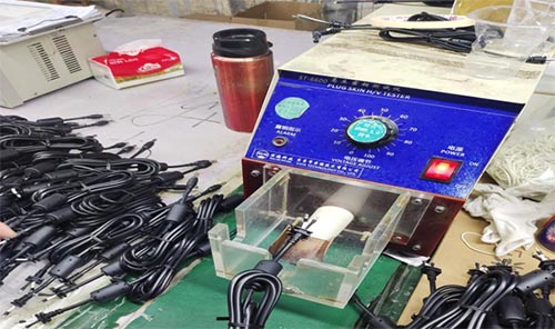 當處理完電源線的內部線條的檢測、電壓的檢測后,還需要對電源線兩頭進行漏電檢測,鐵銹的擦拭處理,最終才能進行封裝處理。