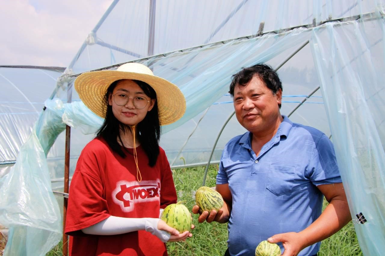 圖為臧加超老板帶領團隊成員參觀香瓜種植大棚