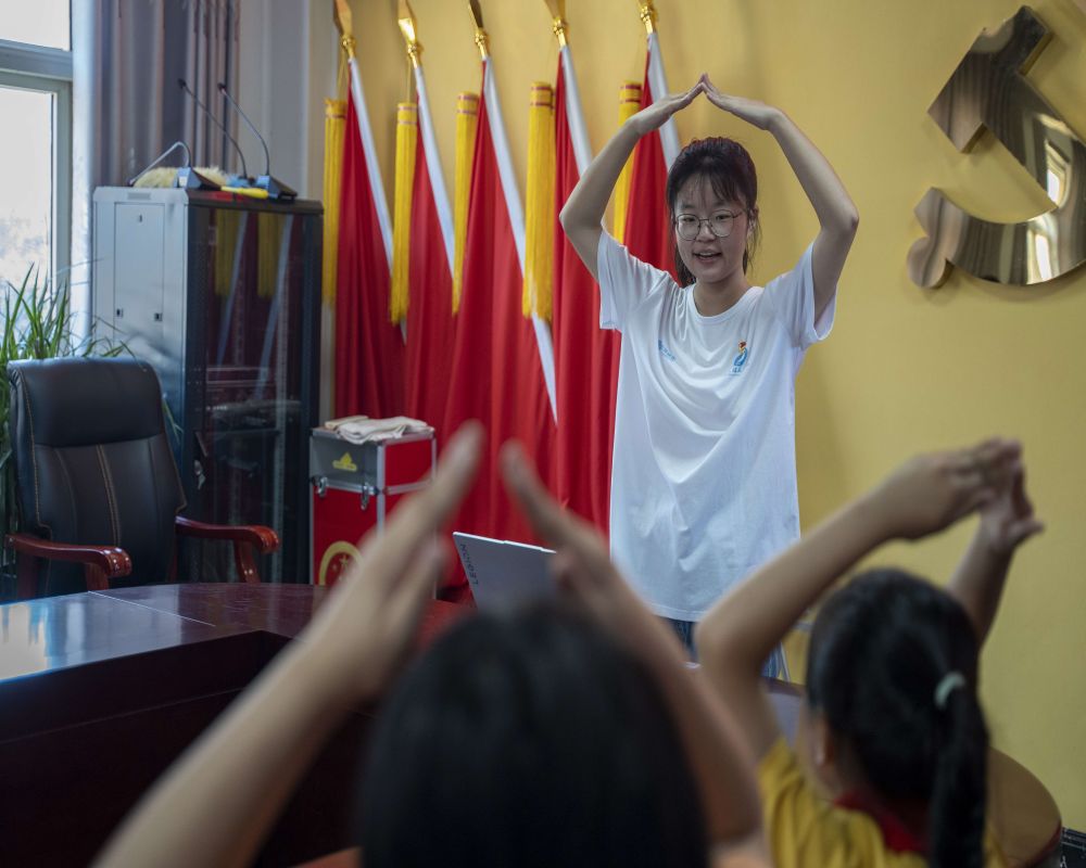 圖為志愿服務隊志愿者教留守兒童《三字經》手語操