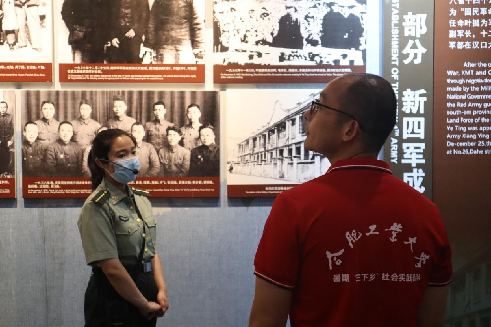 在新四軍軍部舊址,跟隨講解員的引領(lǐng),實(shí)踐隊(duì)員們依次參觀了新四軍軍部舊址、史料陳列館、軍部大會(huì)堂等地,在講解中重溫新四軍英勇抗戰(zhàn)的歷史,瞻仰革命先烈的紅色遺物和戰(zhàn)爭照片,參觀先輩們生活工作的舊居。一床一桌,三兩木凳,便是各軍長臥室和辦公室的全貌,此等清貧,不難想象眾多將士當(dāng)時(shí)生活和戰(zhàn)斗的艱苦,簡陋且粗糙的桌椅板凳無不展現(xiàn)出老一輩無產(chǎn)階級(jí)革命家艱苦樸素的生活以及為了民族大義忘我工作的點(diǎn)點(diǎn)滴滴;憶往昔崢嶸歲月,陳列館內(nèi)一幅幅泛黃的照片、一張張新四軍的作戰(zhàn)地圖、一件件新四軍使用過的槍械,均見證著新四軍將士金戈鐵馬斬寇兵的烽火歲月;還有白墻之上顯眼的幾個(gè)紅字——“寧做沙場鬼,不做亡國奴”,給后人以警示,前事不忘,后事之師。