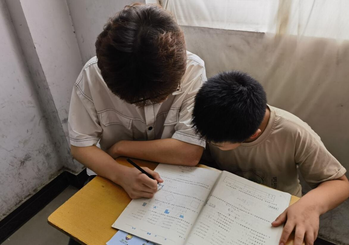 2023年7月17日,在安徽省臨泉縣老集鎮(zhèn)周莊戶村里,志愿者周俊龍去往當(dāng)?shù)卮迩f的一名留守兒童的家去幫助,輔導(dǎo)他學(xué)習(xí),一起玩耍。在他這個年紀(jì),志愿者本身也是一名留守兒童,所以志愿者深知情牽留守,愛暖童心的重要性。