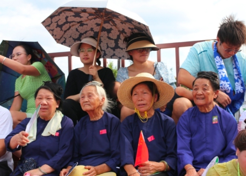 圖為幾位耄耋之年的老人手持國旗在34℃的天氣下在看臺上為“村超”加油助威。李建勛 攝