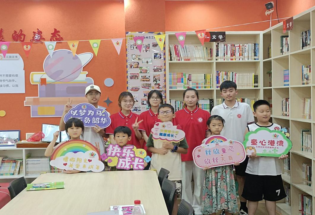(暑期青少年實踐志愿服務隊成員同小朋友們合影留念 劉倩/攝)