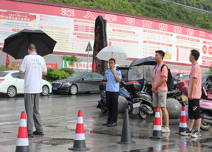 實踐團第一站來到了彭水縣保家鎮彭水第二中學。在政府領導的帶領下實踐團的成員們擔負起現場秩序維護以及交通指揮工作。在此期間實踐團的成員們積極履行工作義務,協助主辦方維護比賽現場秩序,妥善處理現場矛盾糾紛。
