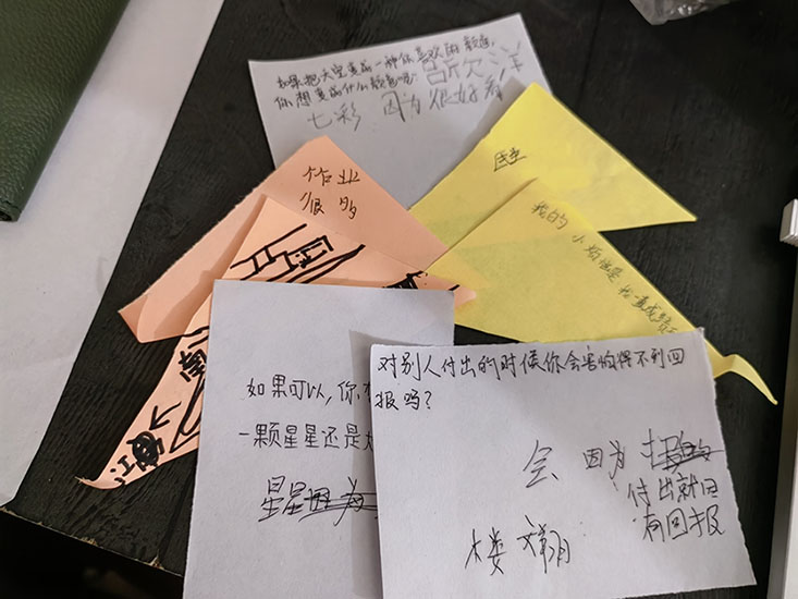 心語(yǔ)心愿筑美好經(jīng)過(guò)“藝童前行”團(tuán)隊(duì)10天的陪伴和關(guān)愛(ài),聯(lián)豐村的小朋友們開(kāi)始依賴(lài)和主動(dòng)接近團(tuán)隊(duì)成員,但始終沒(méi)有向團(tuán)隊(duì)敞開(kāi)他們的內(nèi)心。為切實(shí)深入了解聯(lián)豐村兒童的心理狀態(tài),“藝童前行”團(tuán)隊(duì)在實(shí)踐后期借助“愿望箱&煩惱箱”活動(dòng)鼓勵(lì)孩子們吐出心中的不快或向往,粉碎煩惱,筑夢(mèng)美好,努力守護(hù)孩子們此刻的純真。