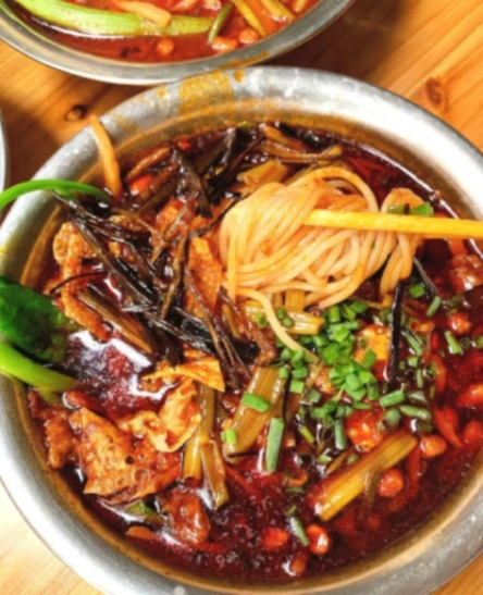 柳州當地的螺螄粉不同于暢銷網絡各式各樣的袋裝螺螄粉,光是參觀螺螄粉的制作過程便給人不同尋常的感受。選取的米粉是柳州當地特有韌勁十足的細粉,將其放入特制的工具中,在滾燙的熱水里來回搖晃個數十秒,將其控水撈出便好了。同時,有不同種類的蔬菜任君挑選,例如空心菜,生菜,木耳菜。這些蔬菜不需要煮得很熟,與米粉的煮法一樣,只需要在熱水中“體驗”一番足矣。粉菜結合,再加入已經精心烹制過的酸筍、木耳、花生、蘿卜干,腐竹等等,最后淋上熬制許久的螺螄高湯。湯與各種食材接觸的那一瞬間,將螺螄粉獨有的鮮香全部迸發出來,令人垂涎欲滴。看著便是享受,吃起來更是美味。鮮香酸辣燙,在一碗粉中同時品味出來,沒有網上風靡的“臭味”,有的只是螺螄粉給人味蕾的刺激,想要再品嘗一碗的沖動。