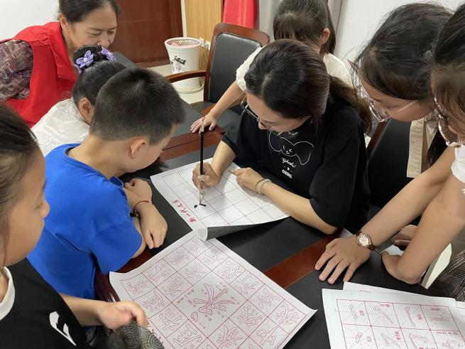 每次上課前,學生志愿者都提前到達場地,孩子們早已翹首盼望。課堂上,師生親切互動,大家一起了解新知識、制作小手工、開展小游戲。每節課孩子們都收獲頗豐,從靖江當地的黨史知識到親手學寫毛筆字,課堂內容包羅萬象、實踐活動豐富多彩。活動最后一天,大家依依不舍,小朋友們還在期待以后的課程活動。