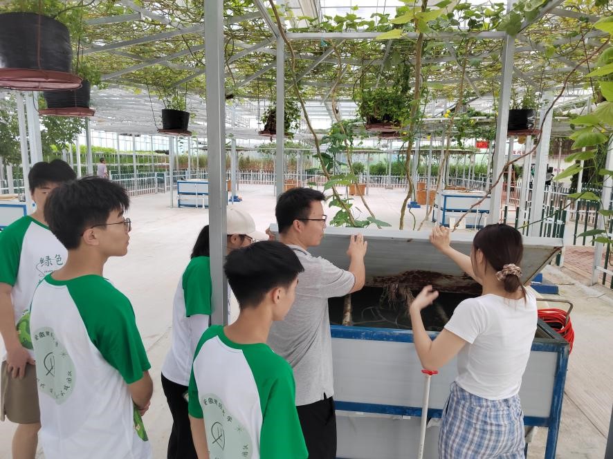 7月12日,實(shí)踐團(tuán)隊(duì)赴蚌埠國(guó)家農(nóng)業(yè)科技示范園,實(shí)地調(diào)研園區(qū)的數(shù)字農(nóng)業(yè)工作與綠色發(fā)展模式。活動(dòng)中,團(tuán)隊(duì)成員與指導(dǎo)老師在講解員的帶領(lǐng)下集中參觀了園區(qū)勞動(dòng)教育實(shí)踐基地?zé)釒е参镎故攫^和高科技果蔬栽培展示廳。在參觀過(guò)程中,團(tuán)隊(duì)成員欣賞到來(lái)自不同產(chǎn)地、具有不同習(xí)性的熱帶植物,觀摩了無(wú)土栽培模式中各種基質(zhì)栽培模式、種植技術(shù)、高科技育苗水肥一體化系統(tǒng)的運(yùn)行流程。在這種“無(wú)土栽培”模式下,工作人員可以通過(guò)手機(jī)智能監(jiān)測(cè)植物的生長(zhǎng)情況,及時(shí)地調(diào)整水分、養(yǎng)分等,實(shí)現(xiàn)植物生長(zhǎng)的精準(zhǔn)把控,從而達(dá)到節(jié)本增效、減少環(huán)境污染的目的。座談會(huì)上,園區(qū)領(lǐng)導(dǎo)向成員們介紹了農(nóng)業(yè)園數(shù)字農(nóng)業(yè)發(fā)展情況,包括智能溫室大棚建設(shè)、特色產(chǎn)業(yè)發(fā)展、農(nóng)作物經(jīng)濟(jì)生態(tài)效益等。成員們積極提出自己在參觀中的發(fā)現(xiàn)與問(wèn)題,園區(qū)領(lǐng)導(dǎo)張中捷主任就“綠色數(shù)字化”和“數(shù)字綠色化”兩方面為成員解答疑惑。他表示,現(xiàn)代農(nóng)業(yè)正在向綠色低碳、節(jié)能減排方向穩(wěn)步向前。新型無(wú)土栽培技術(shù)、農(nóng)業(yè)物聯(lián)網(wǎng)等農(nóng)業(yè)技術(shù)可以有效節(jié)約水資源、減少?gòu)U棄物排放,這對(duì)農(nóng)業(yè)生態(tài)建設(shè)具有重要意義。