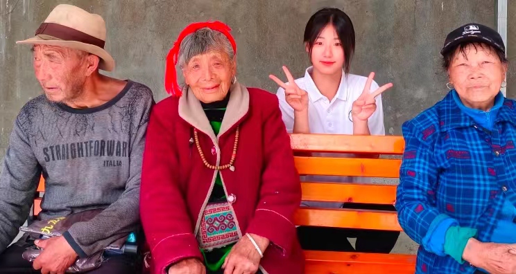我們跟著九龍縣疾控中心的工作人員去看望了當地康復村的爺爺奶奶,他們都很可愛可親、慈祥和藹。一位奶奶養了一只會說話的小鸚鵡,笑瞇瞇地讓我們看鸚鵡學舌;另一位奶奶打扮得特別美,我們剛進院壩里的時候她就在梳頭編發,麻花辮子超級好看,我們的真誠贊美也被奶奶回以甜美的微笑;這位爺爺就用溫和的目光注視著我們和兩位奶奶聊天話家常。離開時,我如愿與他們有了一張合影。看著院前連成片的向日葵,我有一瞬間感覺太陽暖融融的目光籠罩在了身上。