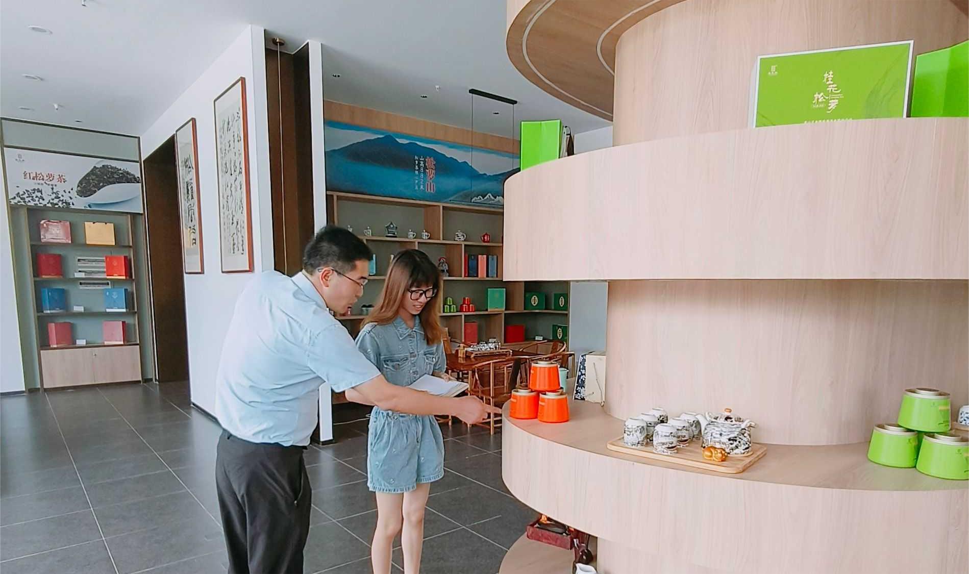 圖二 團隊成員在黃山王光熙松蘿茶葉股份公司總經理的帶領下參觀展廳