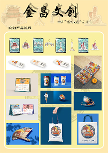 - 首先我們從金昌市的標志性建筑以及標志性物品等入手。將金昌的地表景點、工藝文化、市花等城市特色通過插畫的形式展現出來。使其更加靈動直觀的表現出金昌的文化韻味。地表景點從下往上依次是驪軒古城、金娃娃、鐘鼓樓和礦山公園,同時還繪制了金昌的市花月季花。與特色建筑結合,一起展現金昌的獨特風光。除此之外地毯制作在金昌屬于非物質文化譴產,在文創設計中用地表建筑和市花穿插在一起,表現出金昌文化多元化。
